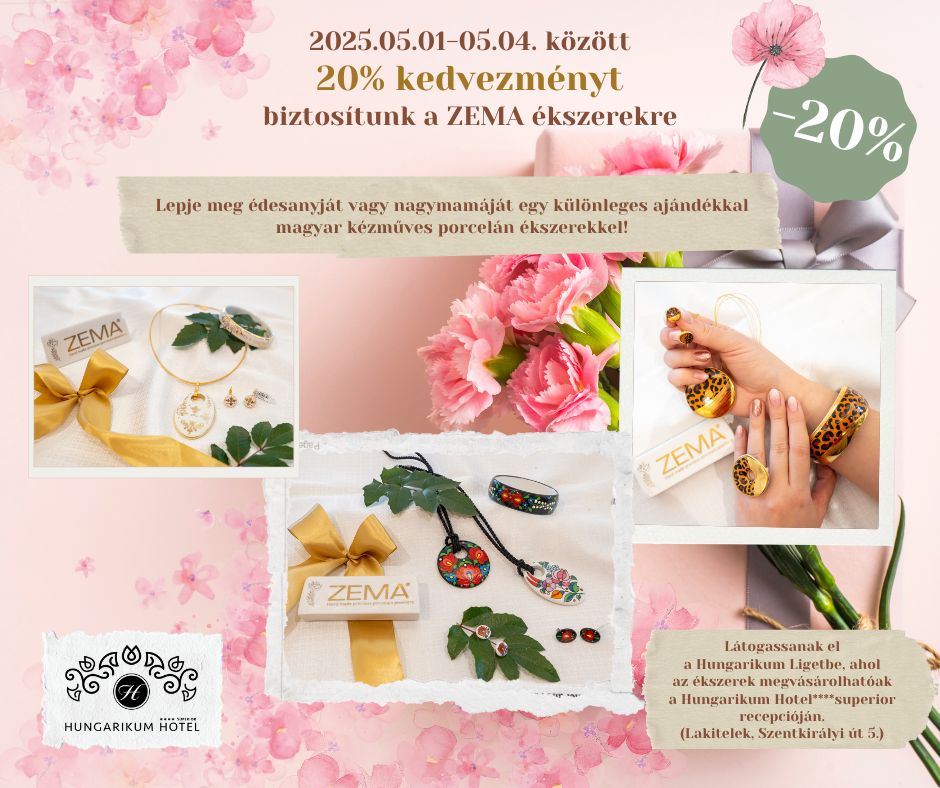 20% kedvezményt biztosítunk minden ZEMA ékszerre – kizárólag a Hungarikum Hotel recepcióján, a Hungarikum Ligetben!