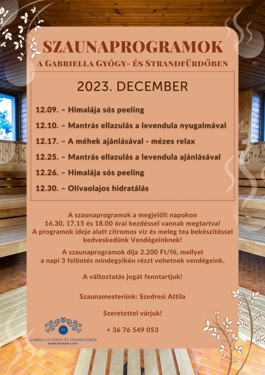 Szeretettel ajánljuk kedves Vendégeinknek novemberben is a Gabriella Gyógy- és Strandfürdő különleges szaunaprogramjait!