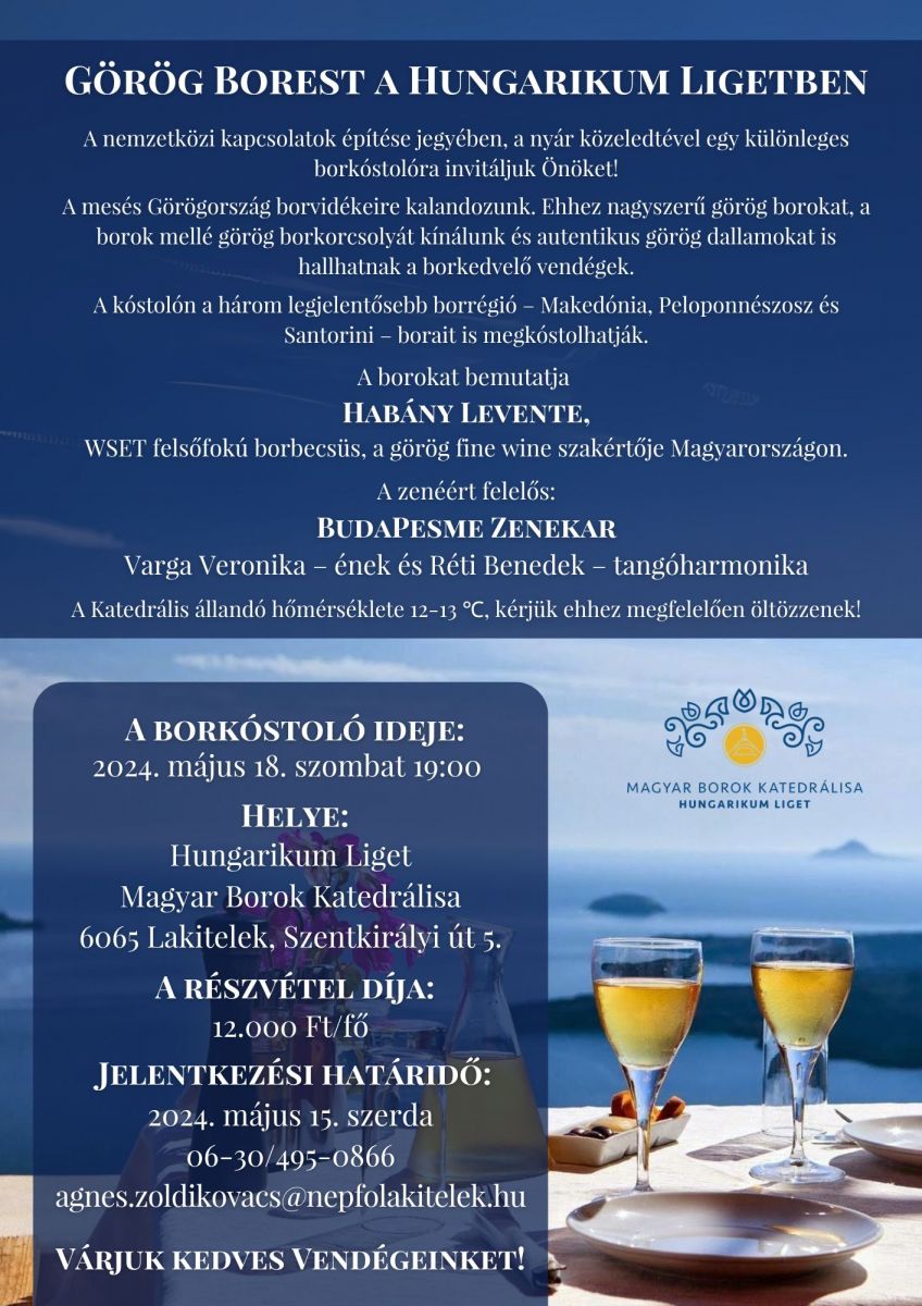 A mesés Görögország borvidékeire kalandozunk. Ehhez nagyszerű görög borokat, a borok mellé görög borkorcsolyát kínálunk és autentikus görög dallamokat is hallhatnak a borkedvelő vendégek.