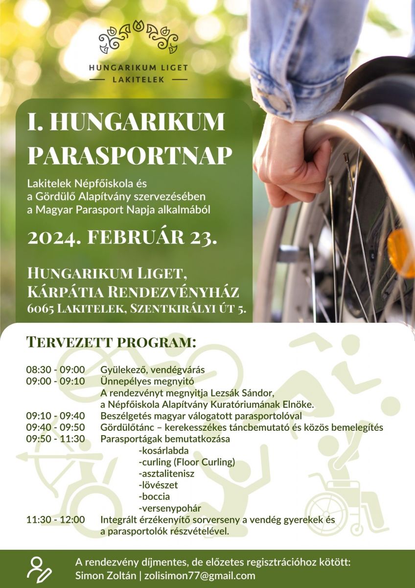 A Lakitelek Népfőiskola és a Gördülő Alapítvány szervezésében a Magyar Parasportnap alkalmából megrendezésre kerül az I. hagyományteremtő Hungarikum Parasportnap a Hungarikum Liget Kárpátia Rendezvényházában 2024. február 23-án!