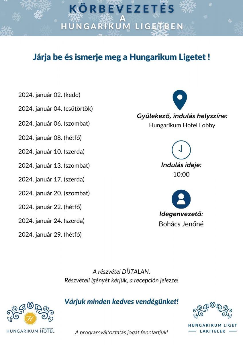 Várunk minden kedves Vendégünket az alábbi időpontokban egy kellemes és egyben érdekes, ismeretterjesztő sétára a Hungarikum Ligetben!