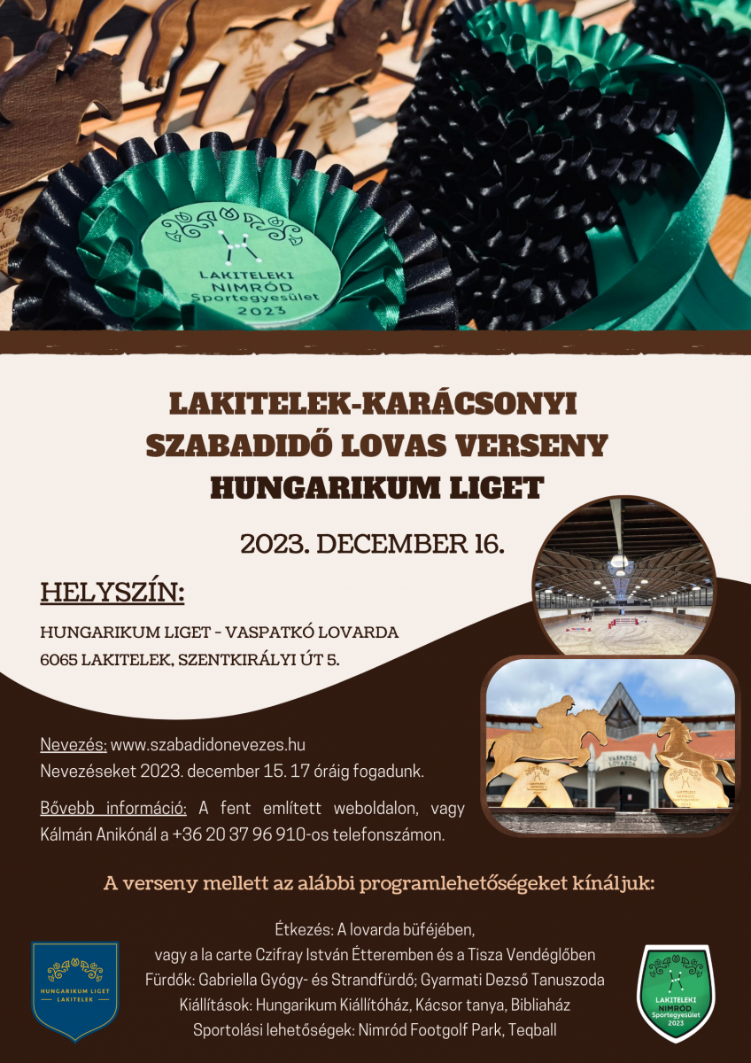 Szeretettel várjuk a Lakitelek-Karácsonyi szabadidő lovas versenyre a Vaspatkó Lovardába! Nevezzen résztvevőként vagy tekintse meg a nem hétköznapi lovas eseményt 2023. december 16-án!