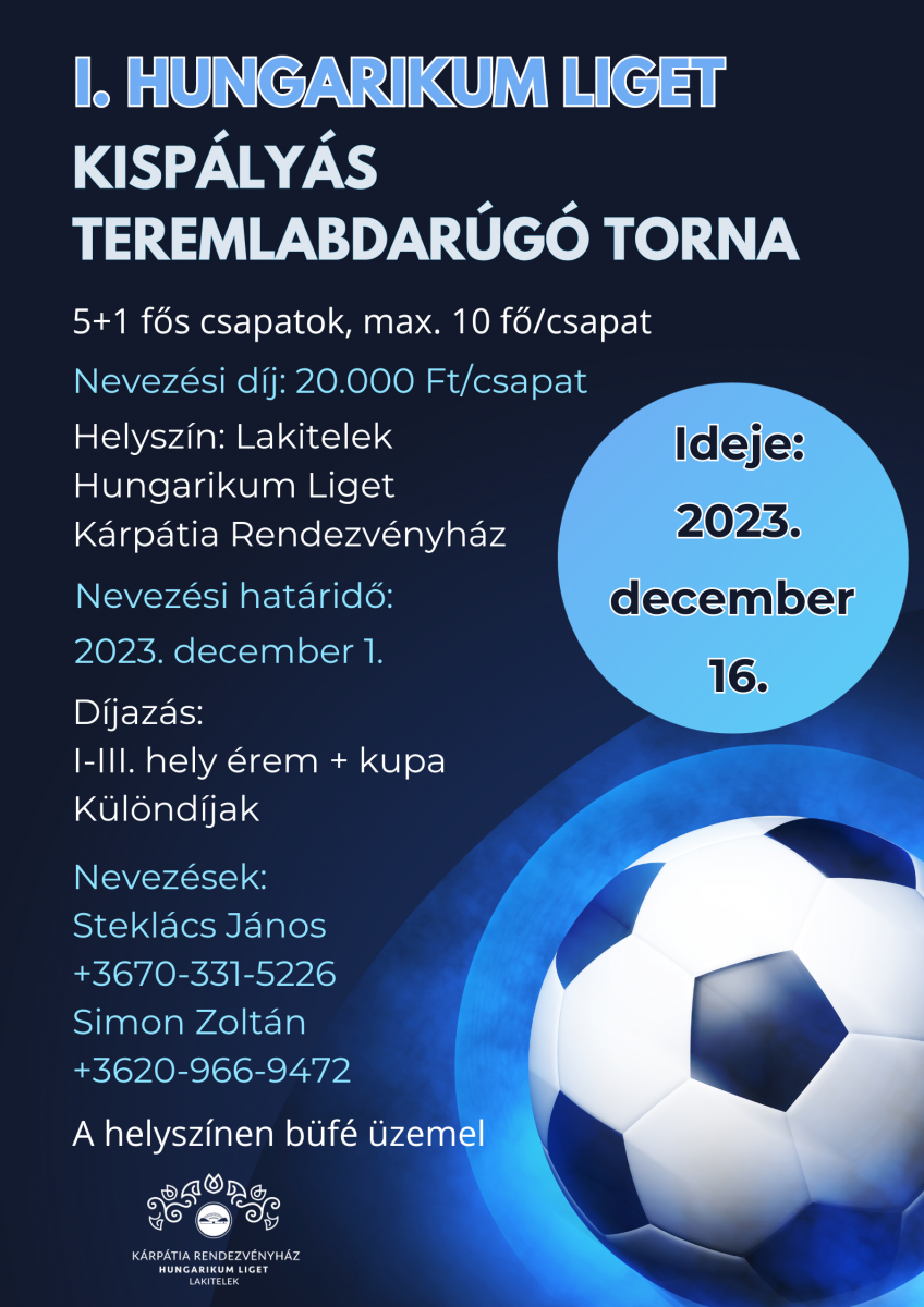 A Kárpátia Rendezvényházban megrendezik az első Hungarikum Liget kispályás teremlabdarúgó tornát! Várják a labdarúgás mestereit és a lelkes nézőket is szeretettel!