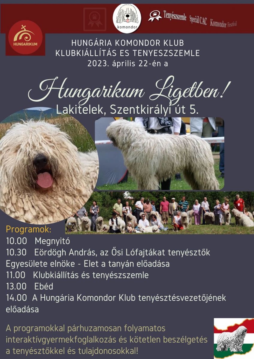 Szeretettel várja az érdeklődőket a Hungária Komondor Klub Klubkiállítás és Tenyészszemle 2023. április 22-én a Hungarikum Ligetben!