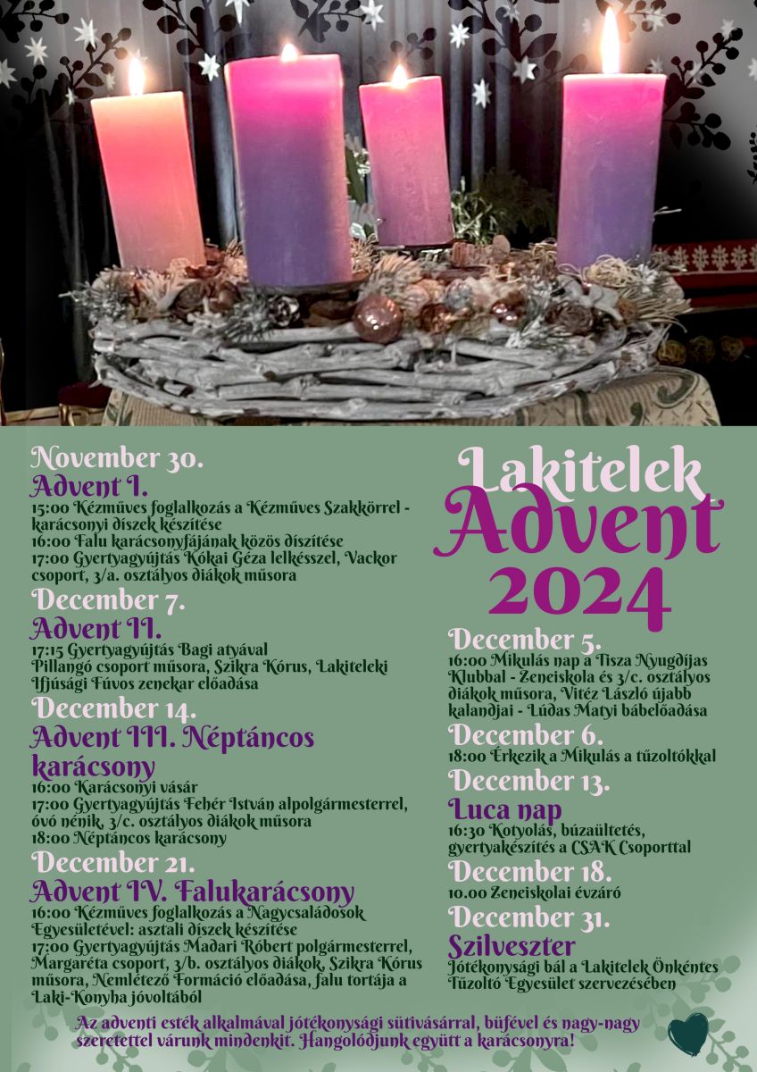 Szeretettel vár mindenkit a hagyományos lakiteleki adventi programokra, ahol közös készülődéssel, karácsonyi vásárral és meghitt gyertyagyújtásokkal hangolódhatnak az ünnepekre!