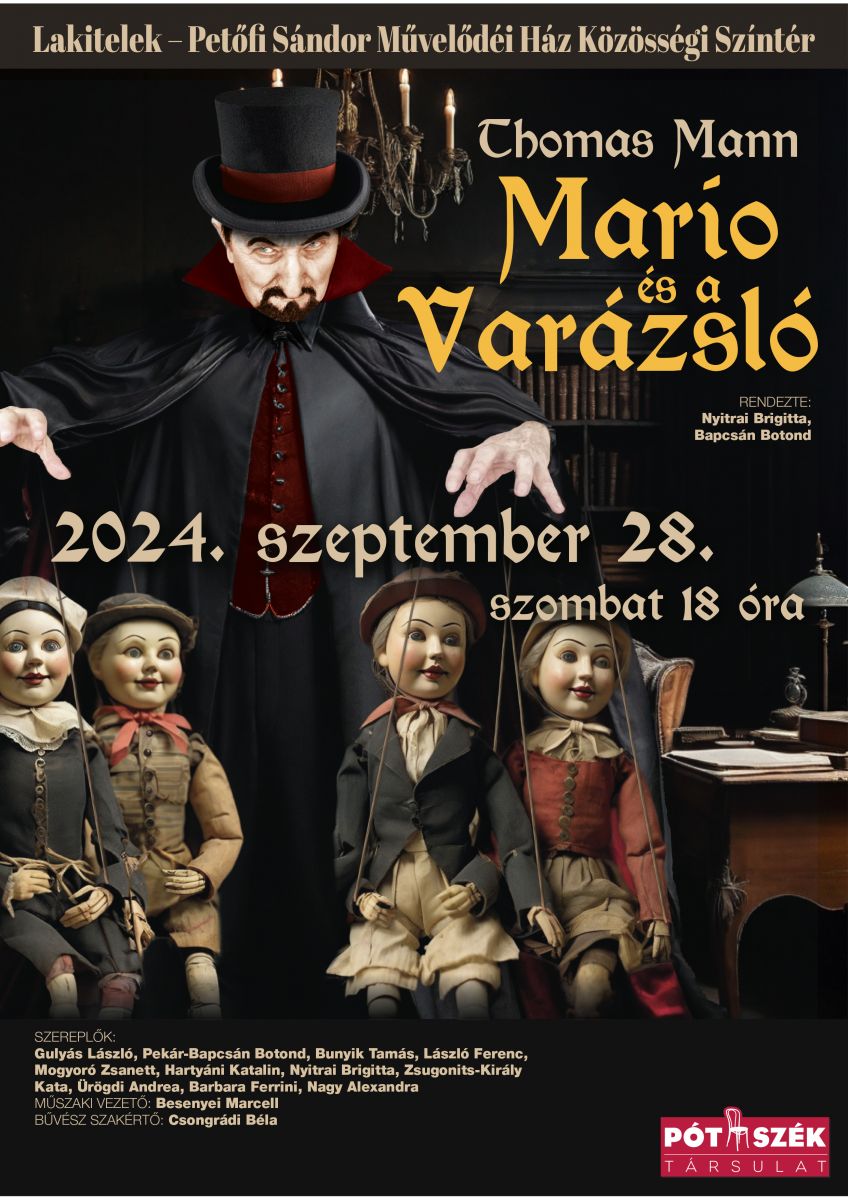 2024. szeptember 28-án, szombaton 18 órától különleges színházi élményben lehet része a közönségnek a Lakiteleki Petőfi Sándor Művelődési Ház közösségi színterén. A Pótszék Társulat előadásában láthatják Thomas Mann híres novellájának színpadi adaptációját, a Márió és a varázsló című drámát.