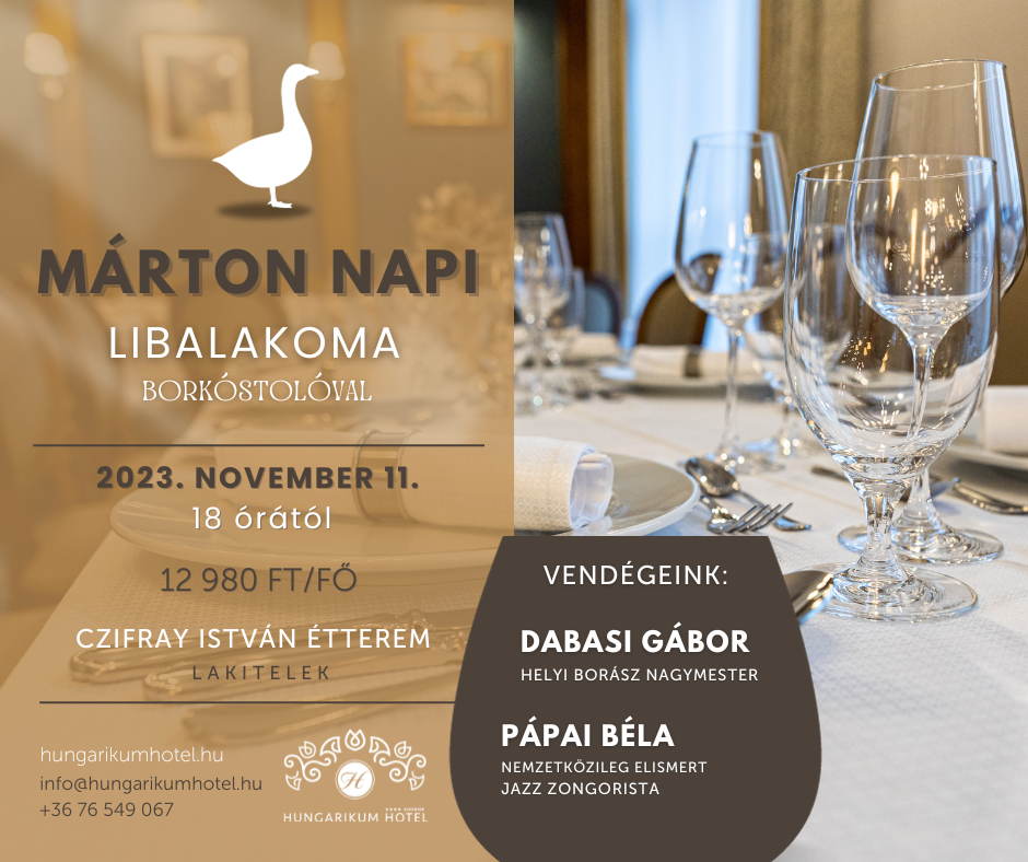 Asztalfoglalás szállással: Márton nap alkalmából 2023.11.11-12. 1 éjszaka foglalása esetén 11%-os kedvezményt adunk ajándékba! Az 1 éjszakás szállásfoglalás tartalmazza a Márton napi vacsorán való részvételt és sok egyéb más szolgáltatásunkat!