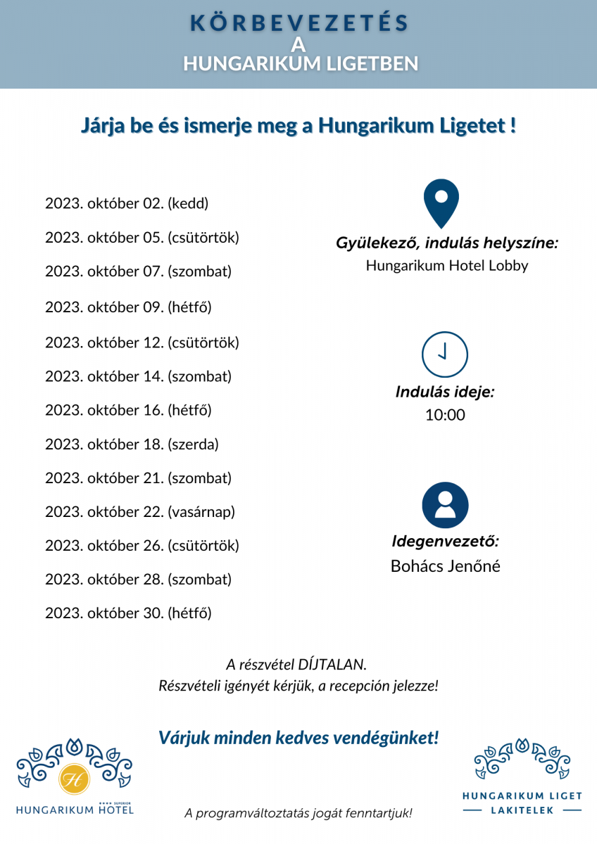 Várunk minden kedves Vendégünket az alábbi időpontokban egy kellemes és egyben érdekes, ismeretterjesztő sétára a Hungarikum Ligetben!