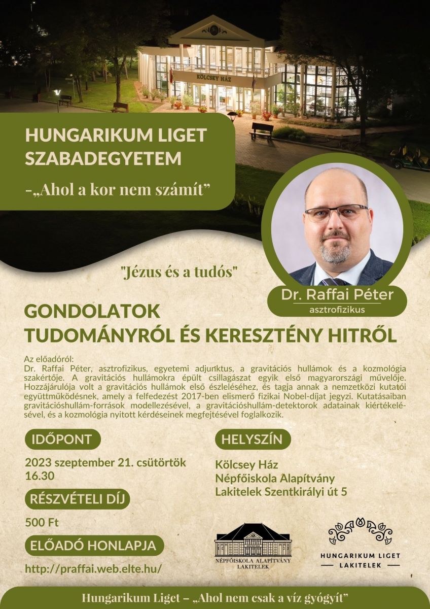 Szeretettel várnak minden érdeklődőt szeptember 21-én csütörtökön Dr. Raffai Péter asztrofizikus "Jézus és a tudós" - Gondolatok a tudományról és a keresztény hitről című előadására a Hungarikum Liget Szabadegyetemre!