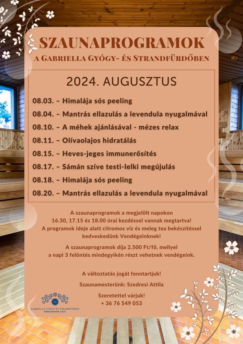 A meleg nyári napokon is frissítő szaunaszeánszokkal várják kedves Vendégeinket a Gabriella Gyógy- és Strandfürdő munkatársai!