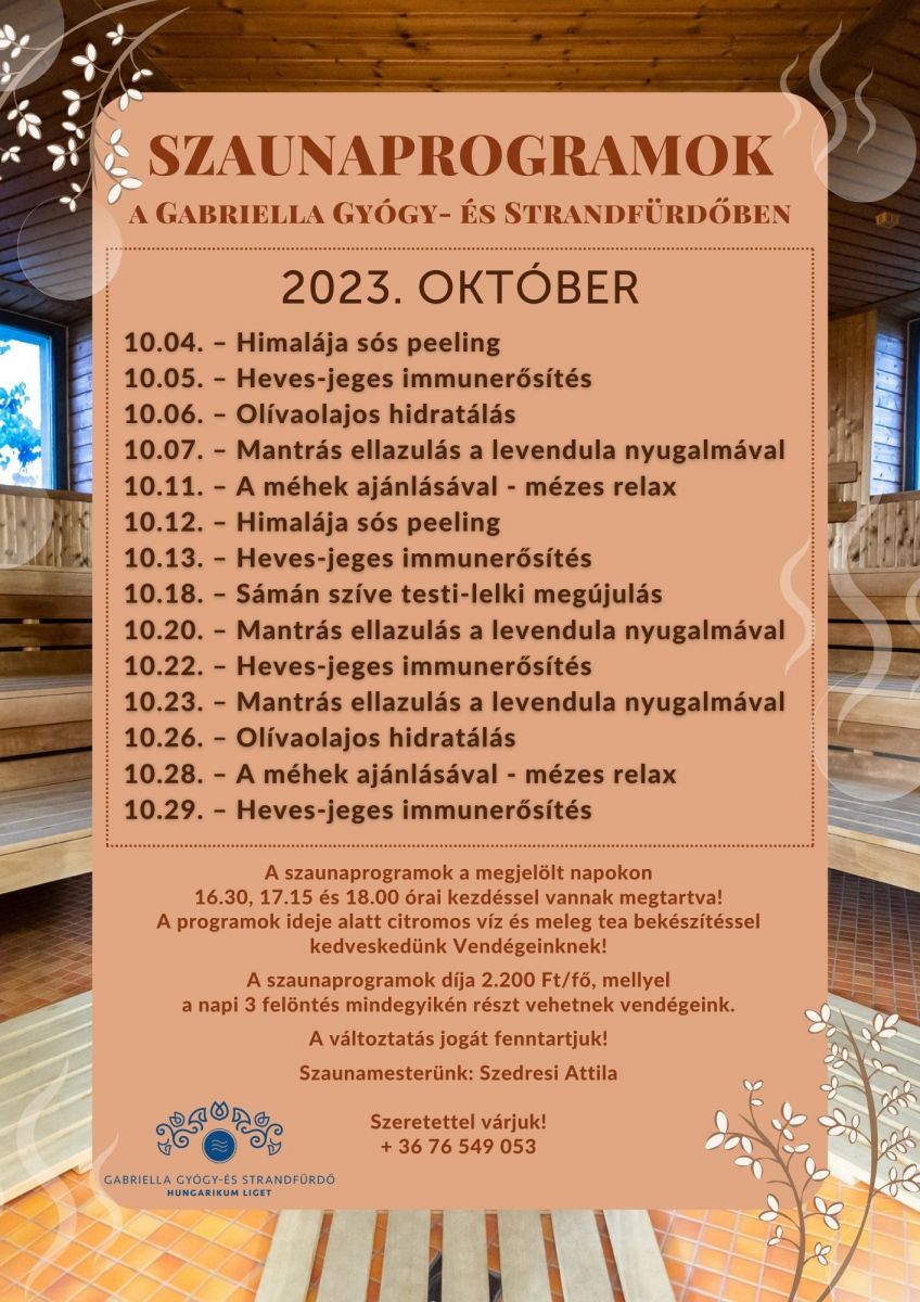 Szeretettel ajánljuk kedves Vendégeinknek októberben is a Gabriella Gyógy- és Strandfürdő különleges szaunaprogramjait!