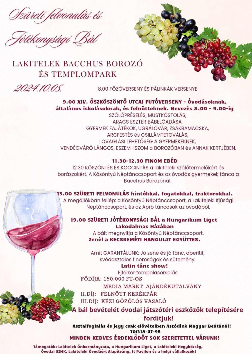 Idén is megrendezésre kerül a hagyományos Szüreti Felvonulás és Jótékonysági Bál Lakiteleken, 2024. október 5-én. A felvonulás egyik megállója a festői Hungarikum Liget lesz, így közvetlenül nálunk is élvezheti a rendezvény hangulatát!