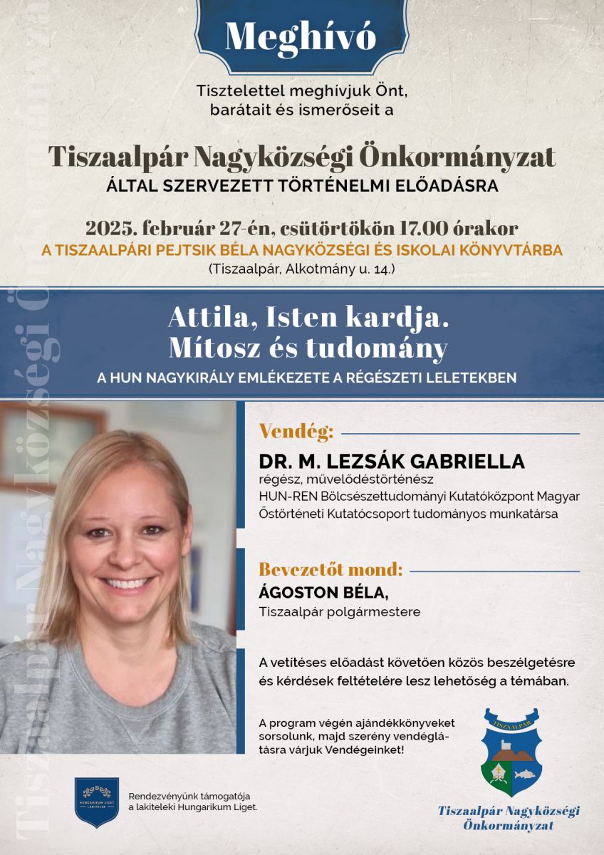 A Tiszaalpár Nagyközségi Önkormányzat tisztelettel meghívja Önt egy különleges történelmi előadásra, amely a hunok és Attila király hagyatékát tárja fel.