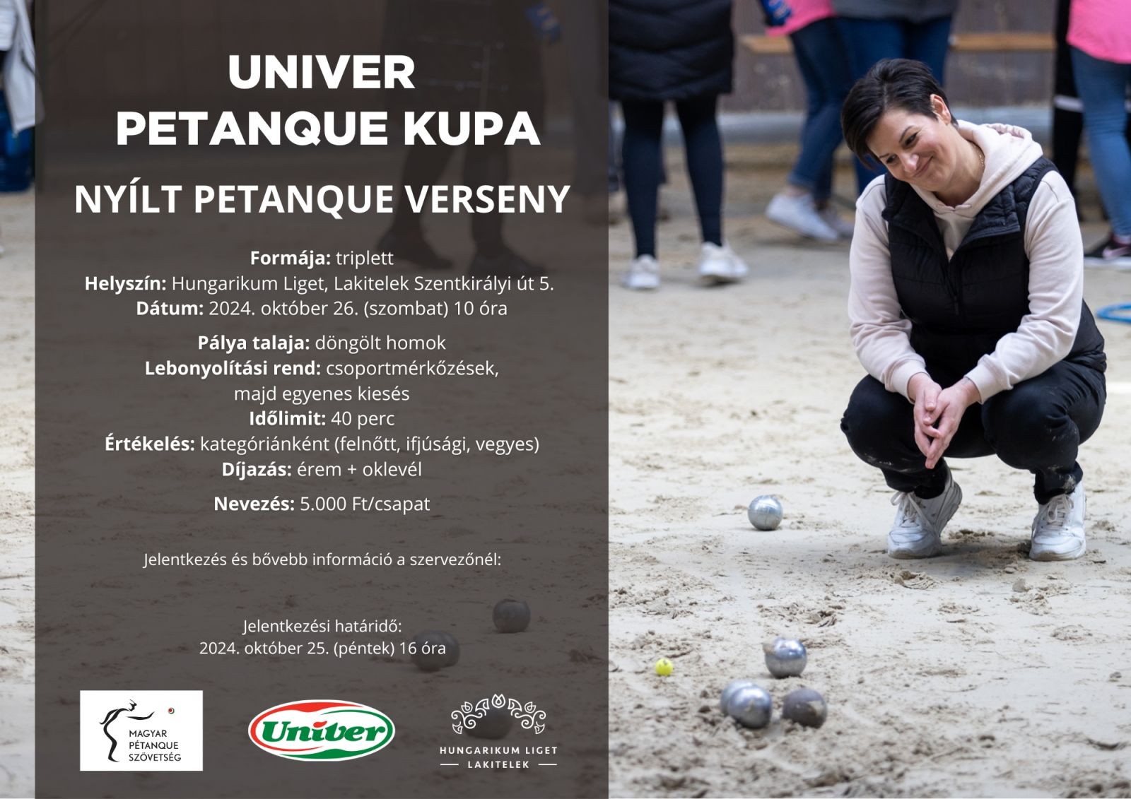 Várunk mindenkit, aki szívesen kipróbálná magát ebben az izgalmas sportban, legyen kezdő vagy tapasztalt játékos. A verseny egy nagyszerű alkalom arra, hogy baráti társaságok, családok és petanque-rajongók egy kellemes napot töltsenek el közösen a természetben.